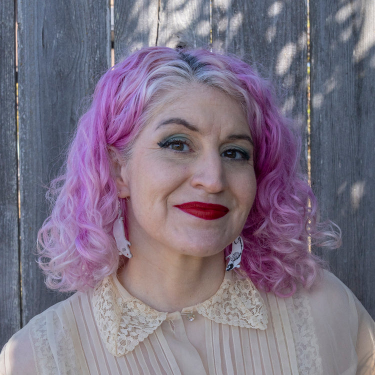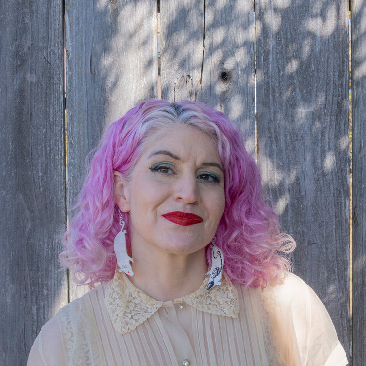 These little double-sided white mouse earrings are so special to me. Besides being adorable spooky creatures, this is first time I've made a beastie in acrylic with hand-painted details. Usually, I just etch a special material, but these are painted after etching. I wasn't sure if it would work and I'm so glad it did. And with their cute red eyes, they look adorable no matter which way they are facing.